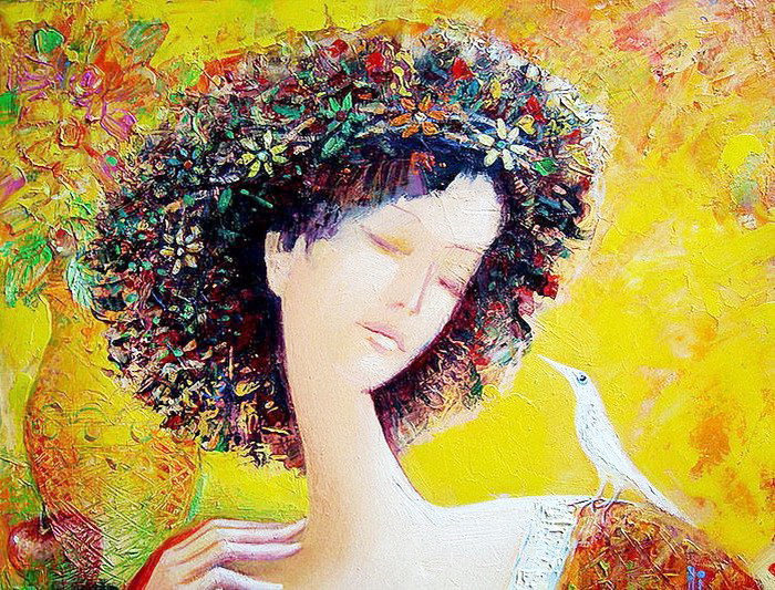 Oleos de mujeres con pájaros